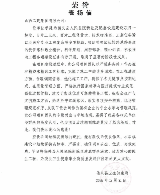 由总承包公司承建的偏关县人民医院新址及配套设施建设项目一标段,作为偏关县重点民生工程,项目团队在工程体量大、技术标准高、工期紧张、医疗专业工程复杂的多重挑战下,科学统筹、攻坚克难,圆满完成年度关键节点任务,赢得了各方高度认可,2025年末收到偏关县卫生健康局签发的表扬信,为全年工作画上圆满句号。