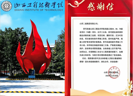 近日,阳泉公司收到山西工程技术学院发来的感谢信,信中对公司承建的尚能公寓5#、6#、7#楼(7#楼)项目团队在冬季施工中攻坚克难、如期完成主体封顶的成果予以高度肯定。